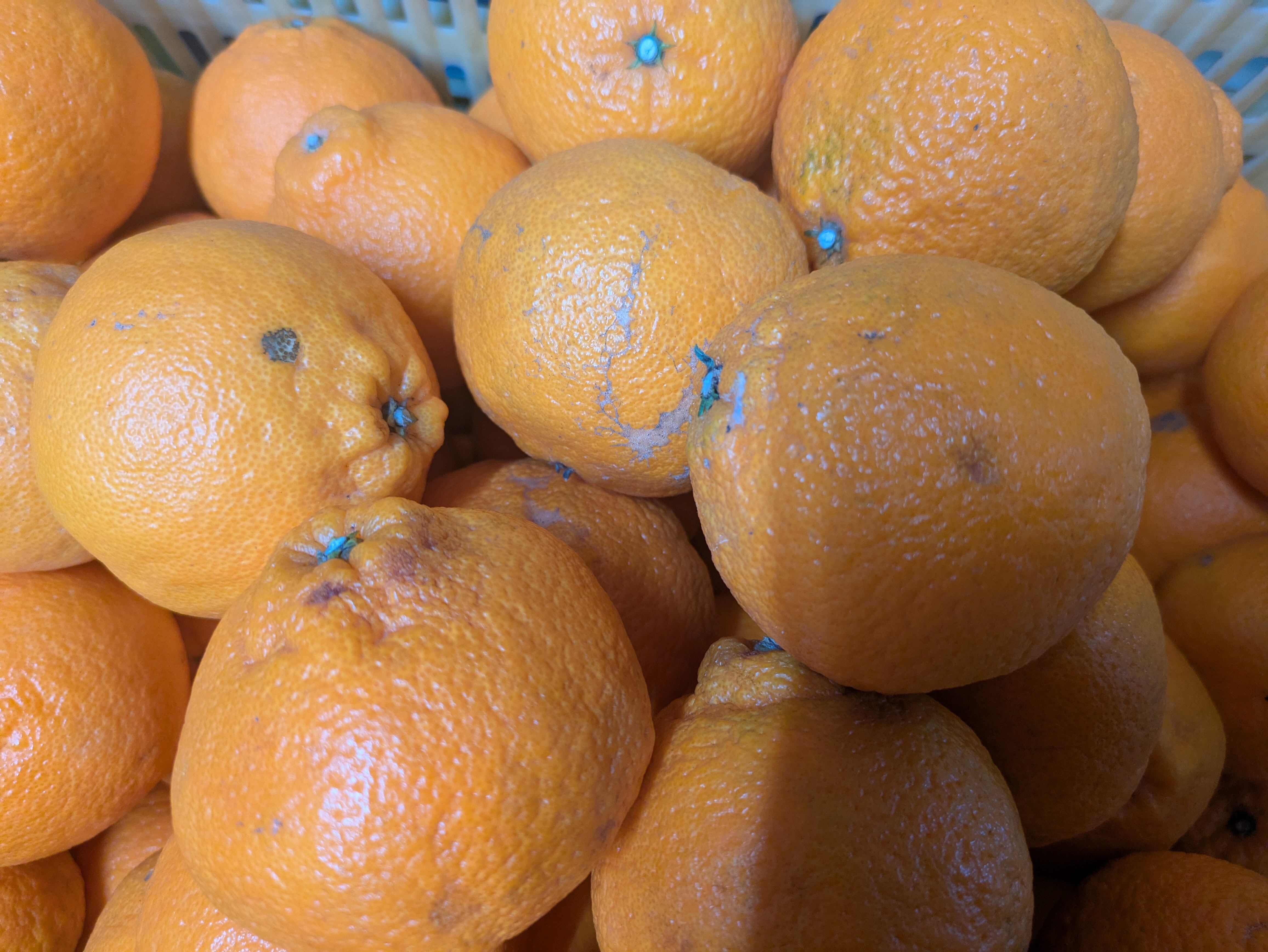 柑橘の王様と呼ばれるしらぬひ(不知火)です。皮は、温州みかんと比べると厚いですが、手で剥くことができ、中の薄皮ごと食べることができます。高い糖度と、程よい酸味があり、果汁たっぷりの品種です。